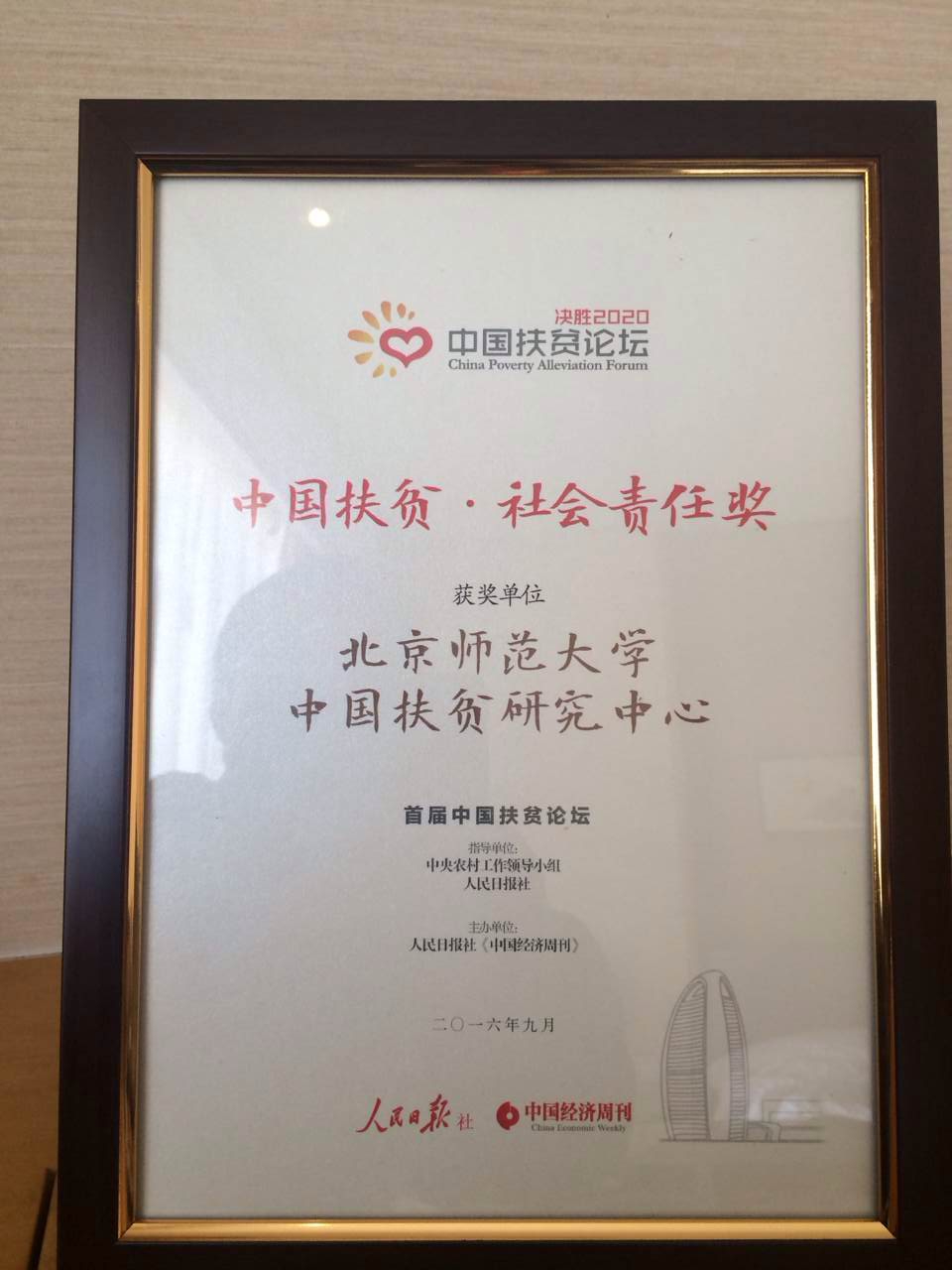 2016年9月27日,由中央农村工作领导小组、人民日报社指导,人民日报社《中国经济周刊》主办,中共定西市委、定西市人民政府承办,经济网、中国经济研究院协办的首届中国扶贫论坛在定西市隆重开幕。论坛颁发了“中国扶贫·政府创新奖”、“中国扶贫·企业贡献奖”和“中国扶贫·社会责任奖”三个奖项。北京师范大学中国扶贫研究中心荣获“中国扶贫·社会责任奖”。