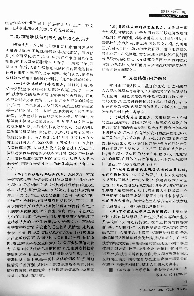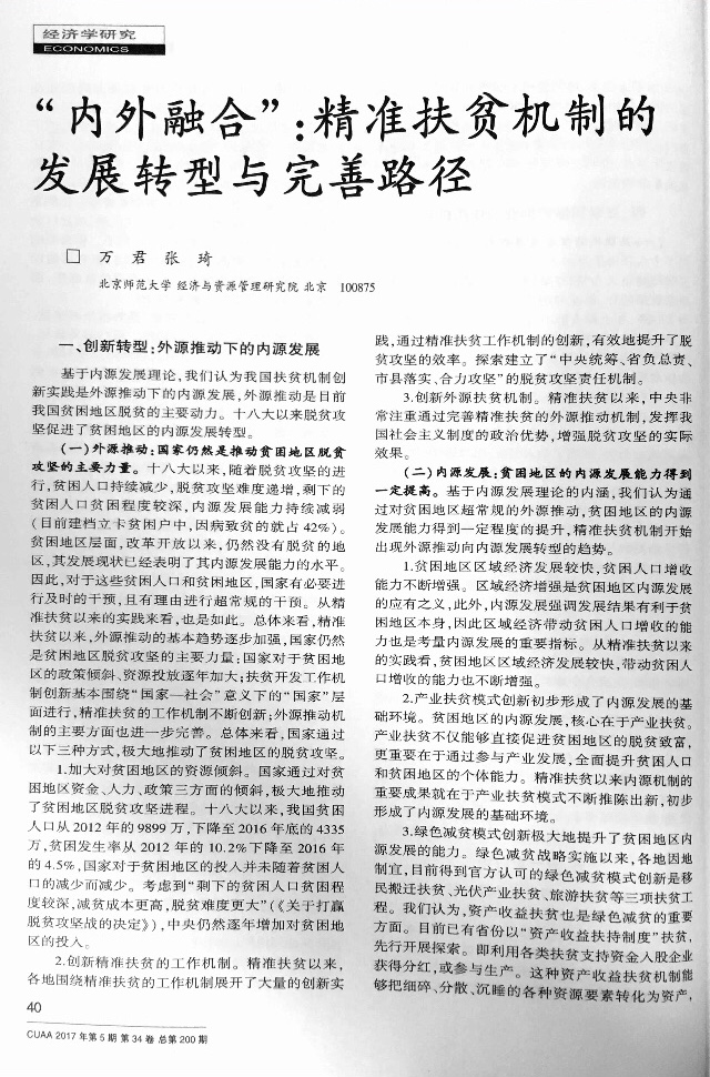 日前,万君、张琦的论文《“内外融合”:精准扶贫机制的发展转型与完善路径》,被我国社会科学“三大文摘”之一的《高等学校文科学术文摘》2017年第5期“经济学研究”栏目转载。