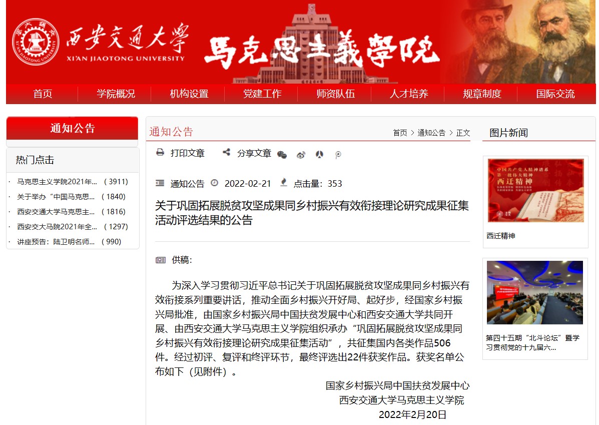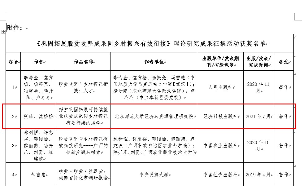 近日,我院收到由国家乡村振兴局中国扶贫发展中心和西安交通大学共同开展、由西安交通大学马克思主义学院组织承办“巩固拓展脱贫攻坚成果同乡村振兴有效衔接理论研究成果征集活动”组委会的通知。我院张琦教授、沈扬扬老师撰写出版的《探索巩固拓展可持续就业扶贫成果同乡村振兴有效衔接的思考》经专家评审认为成果质量优秀。