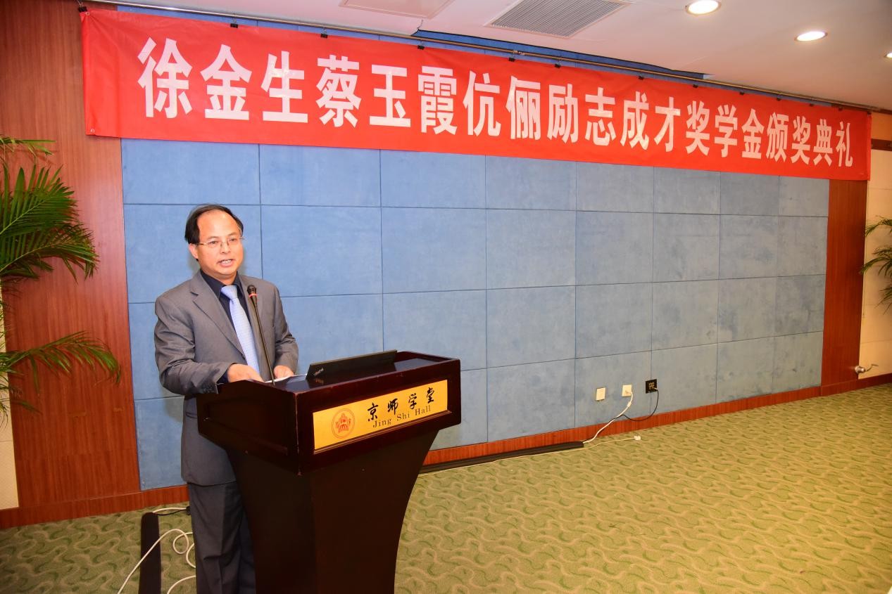 刘晓山副主任代表国务院扶贫办全国扶贫宣传教育中心致辞,刘主任在致辞中表示,打赢脱贫攻坚战是我辈长征路的关键一环,重中之重的内容。北师大是国内较早成立扶贫研究机构的院校之一,设立扶贫基金,开展成才扶贫奖学金活动,践行了“学为人师,行为示范”校训,已将我们这一代人的责任扛在了肩上,走在了全国许多高校的前列。在扶贫政策研究尤其是绿色减贫研究上取得了丰硕研究成果。徐静慧女士作为一名台湾同胞,资助母校扶贫,其行动展现了高尚的道德品质和民族扶贫济困的传统美德,为社会和后人树立了良好的社会导向。相信在北师大等高校自觉行动下,会有更多大专院校和有识之人,投入到扶贫攻坚战斗中来。也希望今天获奖的莘莘学子不忘民族复兴初衷,不忘贫困山区乡亲,不忘老师辛勤教诲,在人生道路中做一名有利于民族进步发展的人,做脱贫攻坚的先锋!