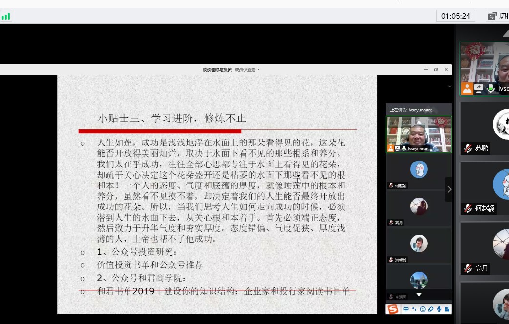 2020年5月27日18:00,中国扶贫研究院邀请到了北京泰信泰富投资顾问有限公司任执行董事马亚教,马总经理从上世纪90年代开始参与资本市场业务的运作及管理工作,曾担任金融机构和上市公司高管,积累了丰富的投资理财和管理经验,并于2005年创建 北京泰信泰富投资顾问有限公司,任执行董事;同是他还兼任多个高校开设了投资管理、项目分析、项目管理实务、市场营销和个人理财业务等课程教学。本次讲座的内容主要围绕资产投资和证券投资,包括股票、证券等相关热点话题,并对近期疫情导致的美国股市熔断现象进行深入浅出的分析,最后针对同学们如何投资,如何在研究生期间打下相关领域的基础提出了宝贵意见。