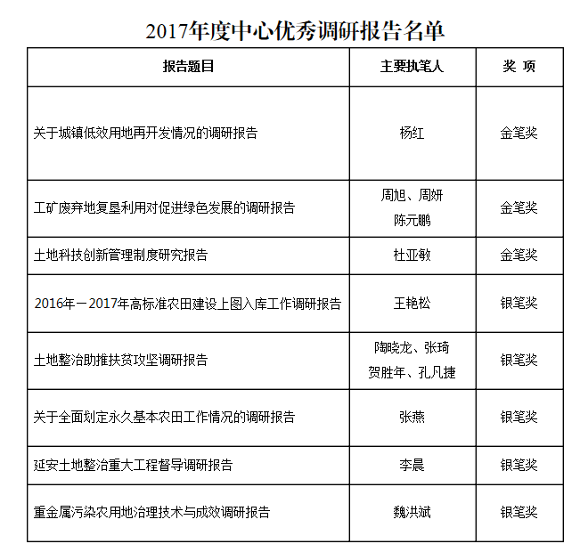 日前,从国土资源部我院土地政治中心获悉,我院参与国土资源部土地整治中心《土地整治助推扶贫攻坚调研报告》一文荣获2017年度优秀调研报告“银笔奖”。