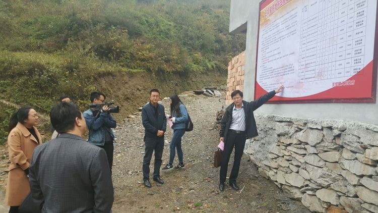 市发改委以工代赈易地搬迁办副主任赵巍峰向调研评估组介绍豆坝镇安何村易地扶贫搬迁公示栏情况。