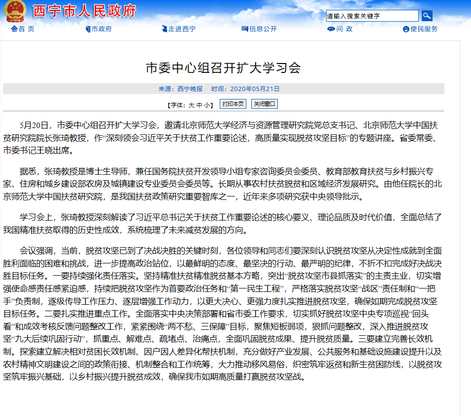 5月20日,市委中心组召开扩大学习会,邀请北京师范大学经济与资源管理研究院党总支书记、北京师范大学中国扶贫研究院院长张琦教授,作“深刻领会习近平关于扶贫工作重要论述,高质量实现脱贫攻坚目标”的专题讲座。省委常委、市委书记王晓出席。