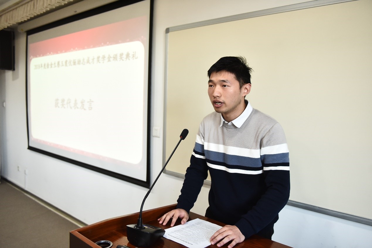 金生学同学在感言中,首先感谢了学校对其的培养和认可、老师以及同学们的关心和支持,也感谢了徐静慧女士对扶贫事业的贡献和坚持。他说道,“学为人师,行为世范”是百年北师不断传承和发展的灵魂,而“聚贤为国,励志成才”则是经资院在新世纪之初确立的崇高使命。他感谢在这一年多的时间里,学校以及学院的老师一直传承着经资院这样的灵魂,也践行着这样的使命,给予了他无私的指导和帮助,尤其是学院的党总支书记、中国扶贫研究院院长张琦老师,在扶贫脱贫问题上数十年如一日地精心研究,对此他感同身受、深受启发。金同学作为精准扶贫政策的亲历者和受益者,坚信只有深入普及教育事业的发展,才能帮助贫困地区实现物质层面上的脱贫,因此他感谢教育给他带来了力量,也感谢了老师们的指导和教诲。