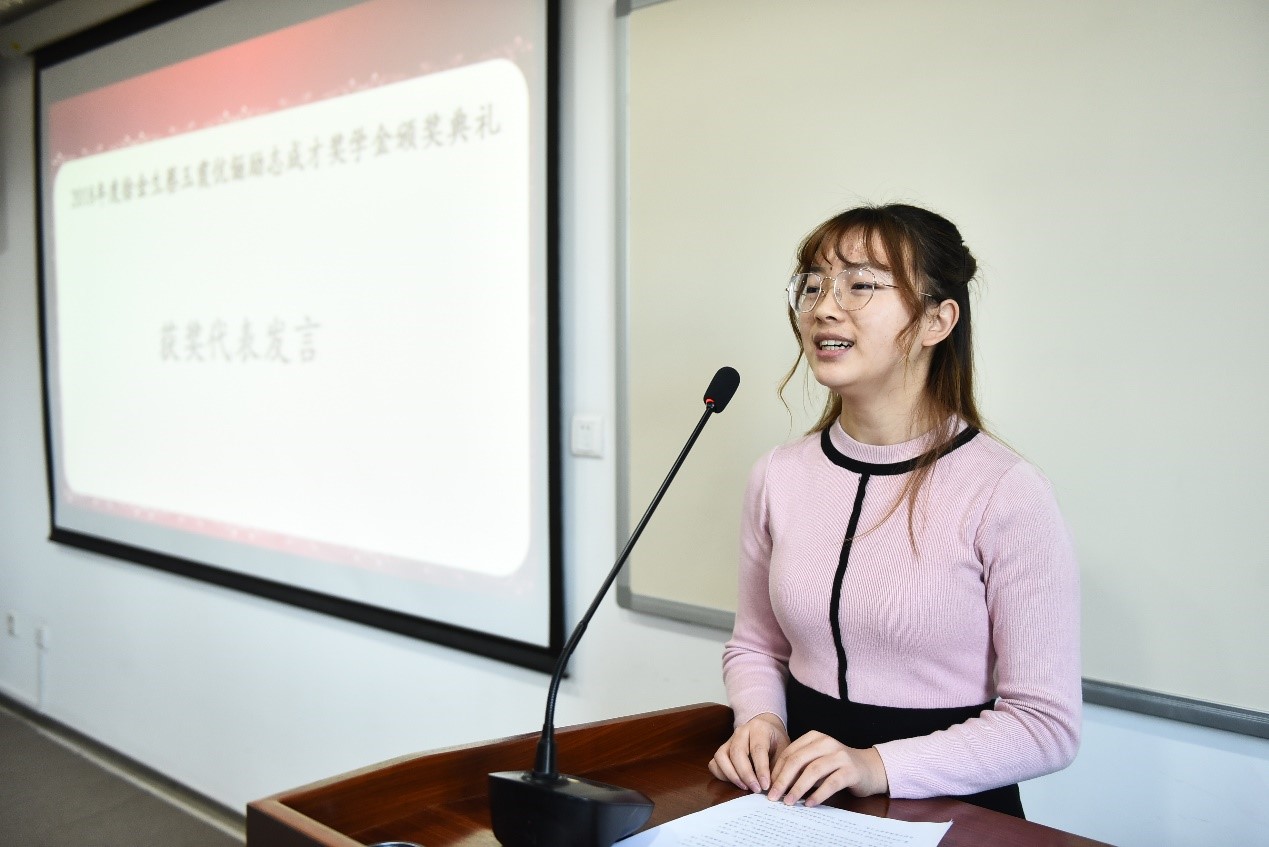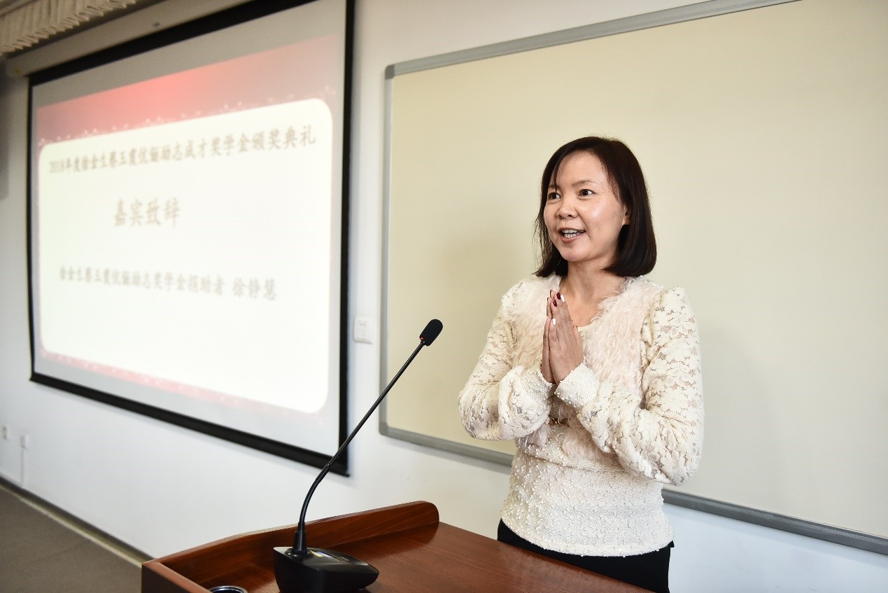 吴洪艳同学在感言中首先表达了对徐静慧女士对有经济困难的同学们的热心帮助。她说“徐金生蔡玉霞伉俪励志成才奖学金”饱含着子女对父母深刻的爱,让她不禁感念父母亲人、师长同窗。接着她表达了对未来和奋斗的理解,吴同学说到越是美好的未来,越需要我们付出艰辛努力。最后她感恩此次获奖能够得到来自社会各界的帮助,希望自己将来主动承担起更多的社会责任,同时再次表达了对徐女士、中国扶贫研究院、经济与资源管理研究院、教育基金会、党委学工部学生资助管理中心辛苦工作的感激之情。