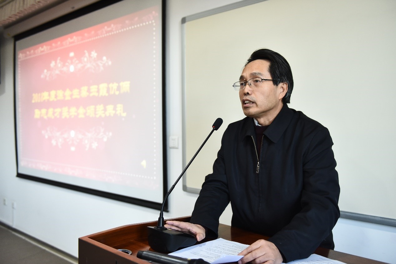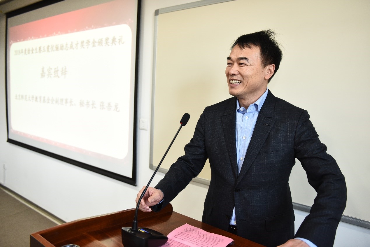 张吾龙副理事长兼秘书长在致辞中首先代表教育基金会向来宾表示欢迎,向广大部门组织对此次活动的支持,并向长期关心和支持我校扶贫工作、热心公益事业的徐静慧女士表示由衷的感谢和崇高的敬意,这体现了我校“学为人师,行为世范”的校训精神,不仅代表着份成长激励,更是一种精神,一份责任担当,并对获奖同学的给予了厚望,希望他们能够不忘初心,砥砺前行为学校发展增光添彩,为民族复兴做出贡献,将这份暖暖的爱心继续传递下去。接着张秘书长对中国扶贫研究院表达了敬意,感谢研究院近几年来在扶贫事业做出的积极努力与贡献。同时,他也感谢国务院扶贫办全国扶贫宣传教育中心等一直以来对我校在扶贫研究上的支持鼓励,希望今后能够继续予以关心帮助和指导,也欢迎社会各界以不同形式支持我校“双一流”发展建设!