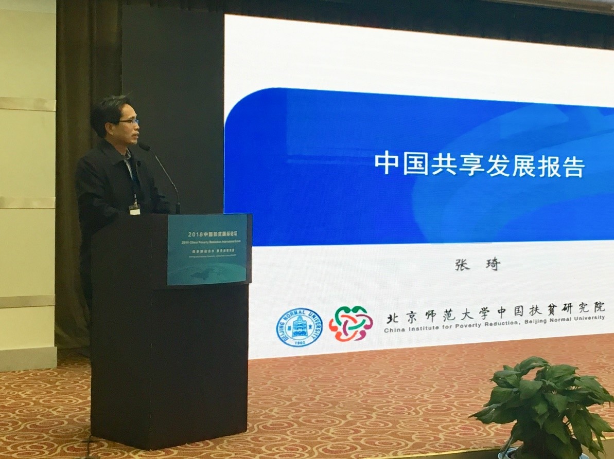 图为张琦教授在“2018中国扶贫国际论坛”就中国共享发展报告的发言