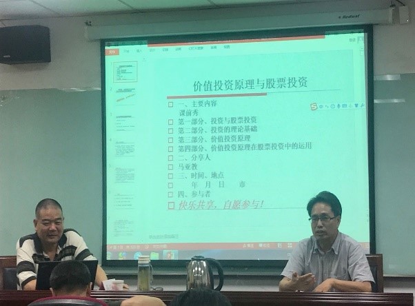 6月27日晚上6点,北师大经济与资源管理研究院第六期“治学·修身”论坛在后主楼1726励志讲堂举行。此次讲座由北京泰信泰富投资顾问有限公司执行董事马亚教先生作题为“价值投资原理与股票投资”的讲座。本次论坛由北京师范大学中国扶贫研究院主办、经济与资源管理研究院研究生会承办,经资院党总支书记、中国扶贫研究院院长张琦教授主持,共有来自北大、北师大经资院及其他院系的40余师生参与。